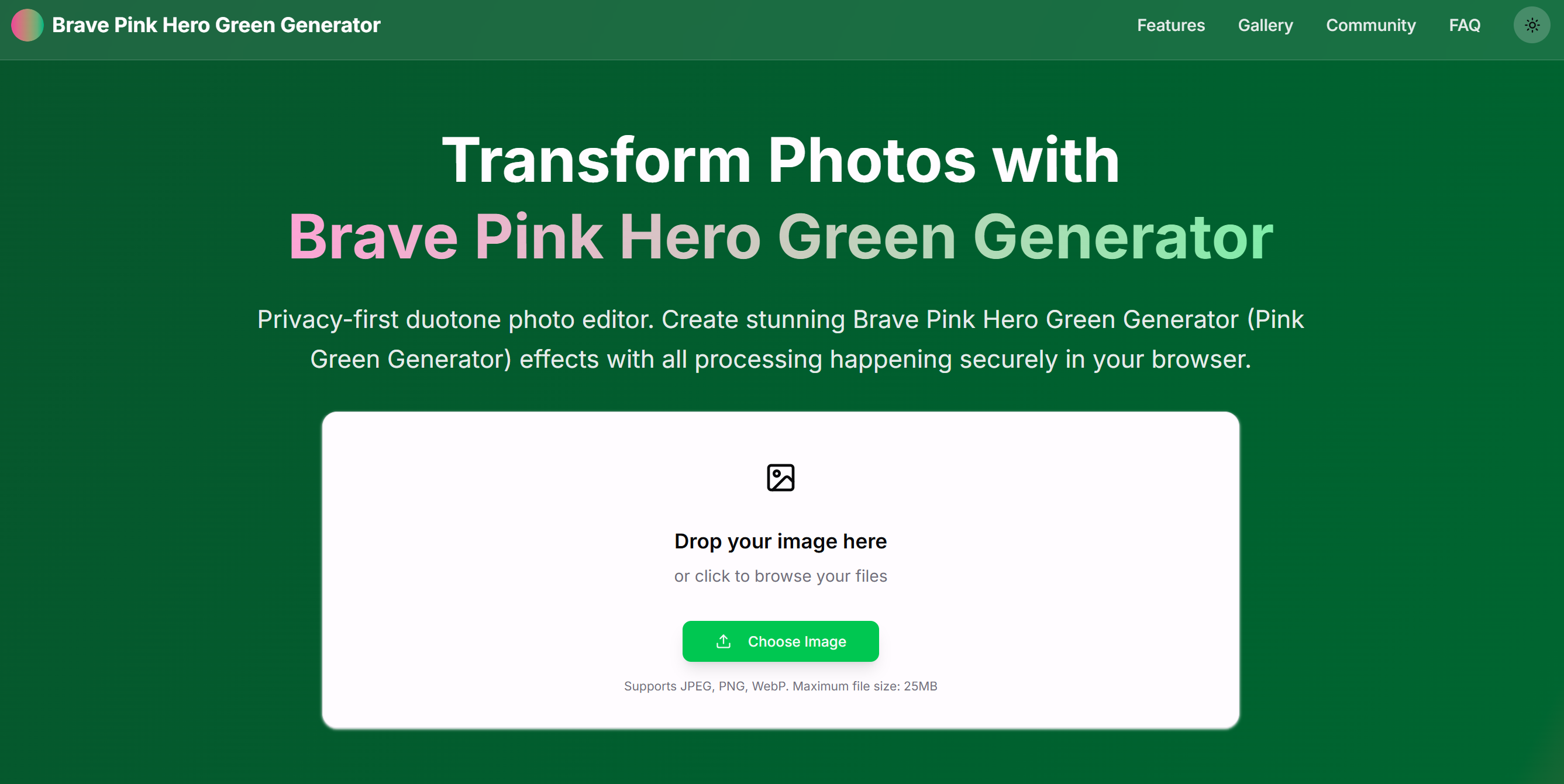 Brave Pink Hero Green是一款照片滤镜工具,能够快速安全地为照片添加美丽的粉色和绿色双色调效果,完全在浏览器中运行。
