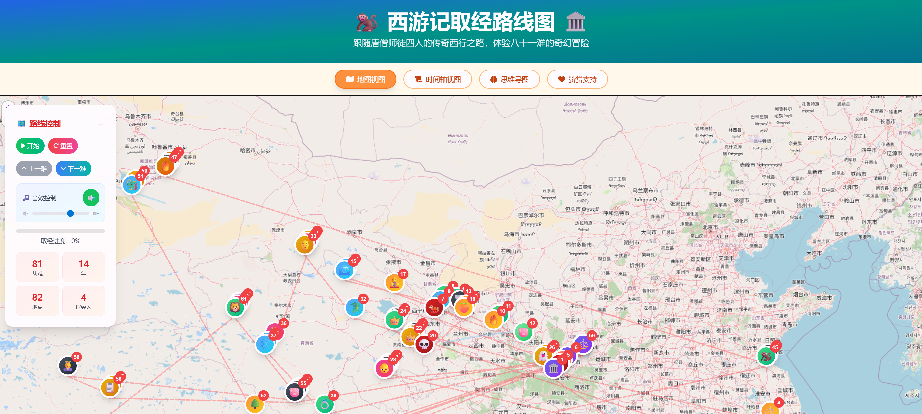 西游记取经路线图是一个互动地图网站,通过地图和时间轴展示唐僧师徒的取经路线和九九八十一难,支持动画效果和音效,适合教学和个人体验。