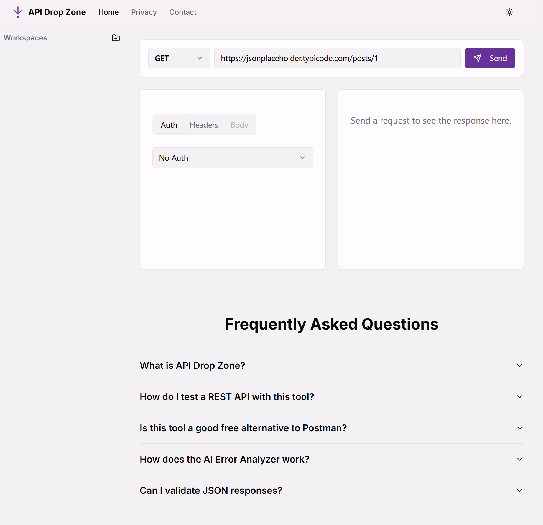 API Drop Zone是一款免费在线API测试工具,用户无需注册即可快速测试API端点,并即时查看JSON/文本响应。