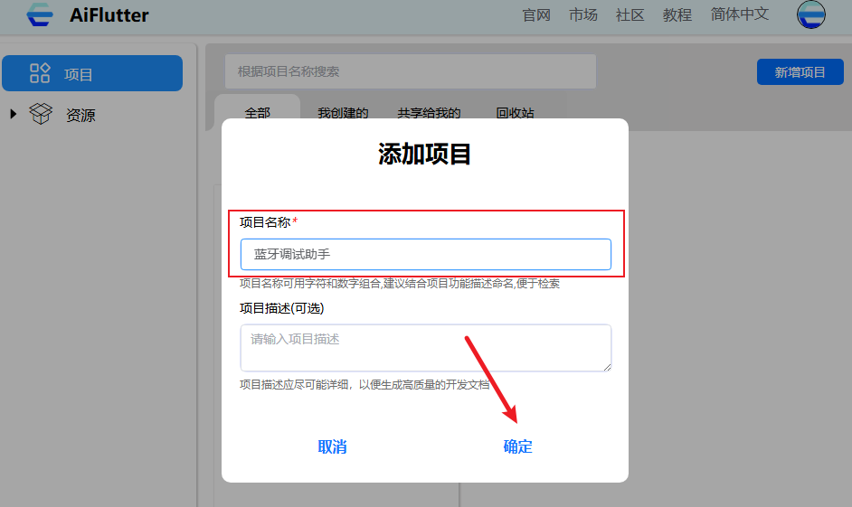 在跳出的弹窗中输入项目名称、项目描述,建议结合项目功能描述命名,便于检索