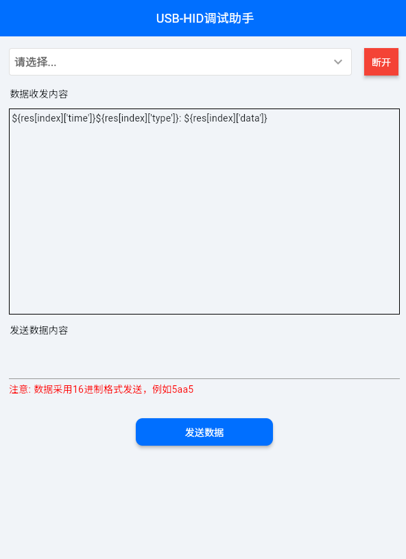 | 功能详情 | 1. 在页面初始化时,扫描USB-HID设备,将得到的USB-HID设备列表进行存储并渲染页面 2. 连接设备,用户在下拉菜单中选择USB-HID设备进行连接 3. 接收数据,连接成功后,会监听数据流并将收到的数据进行存储 4. 发送数据,用户在输入框中输入16进制数据后点击发送即可 5. 实时渲染,一旦有数据过来则进行一次页面构建,保证数据实时刷新 6. 支持设备插拔,设备插拔后依然能够识别到设备并进行连接,不需要重新启动程序 |