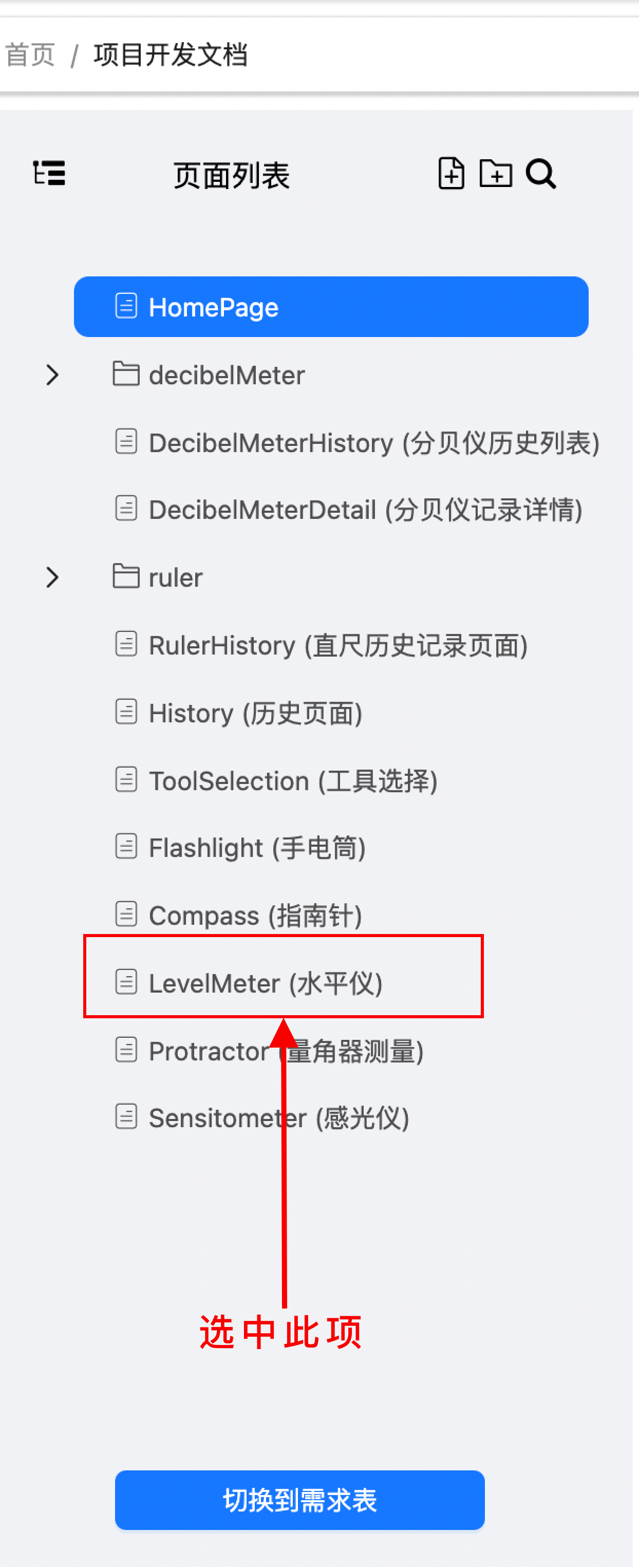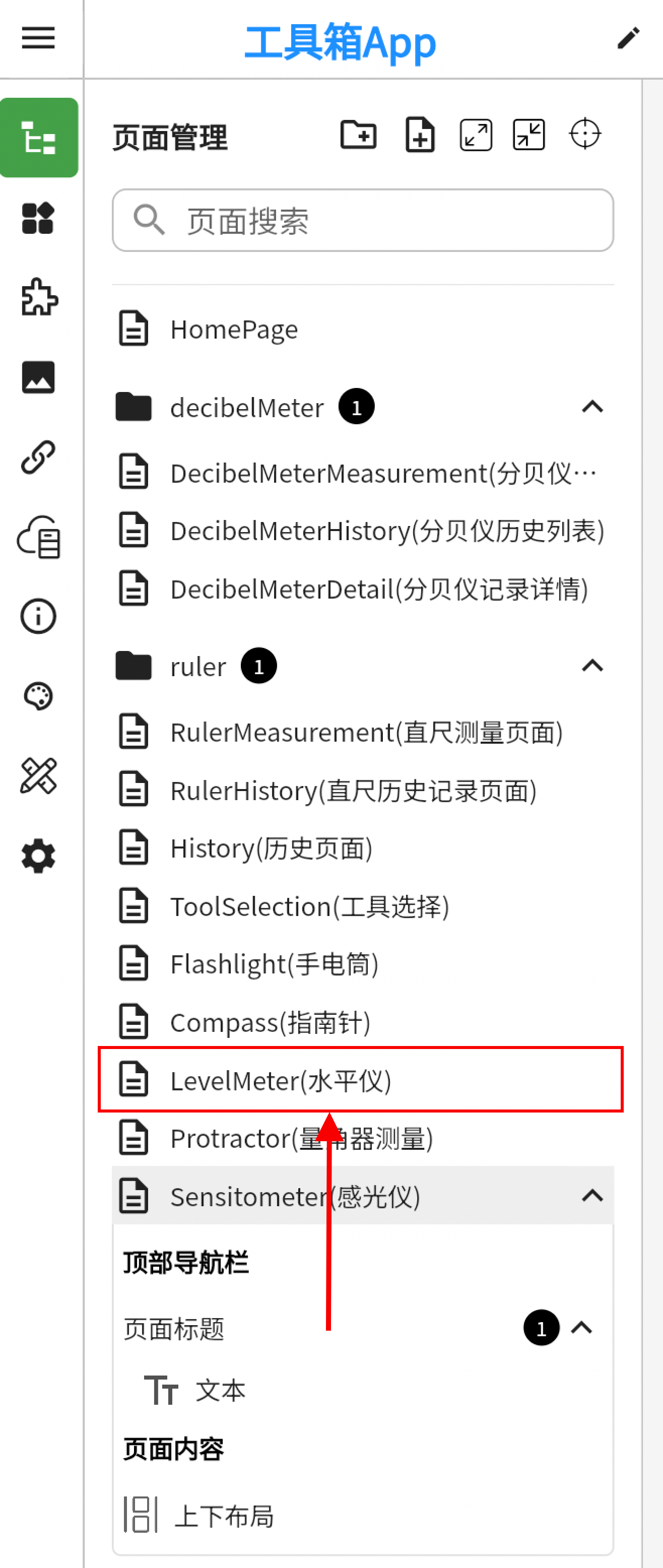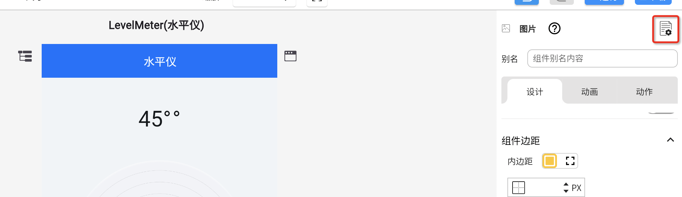 1. 点击右上角 跳转到开发页面,选中“水平仪”页面,开始页面设计。