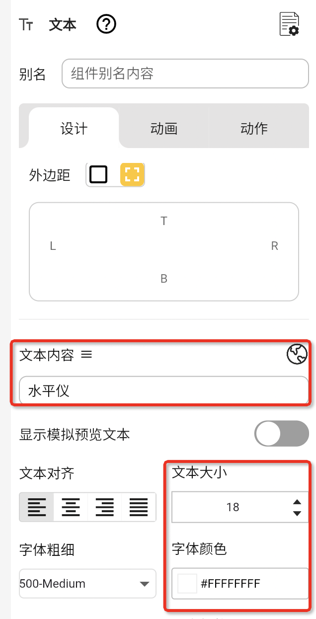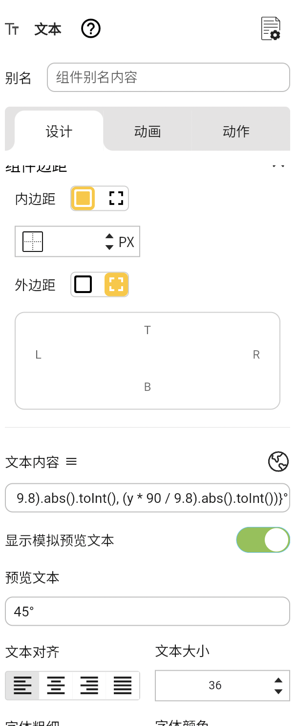 45°,当我们使用变量表示内容后可能会导致内容过长或者显示内容不符合预期,那么我们可以使用模拟预览文本。 -