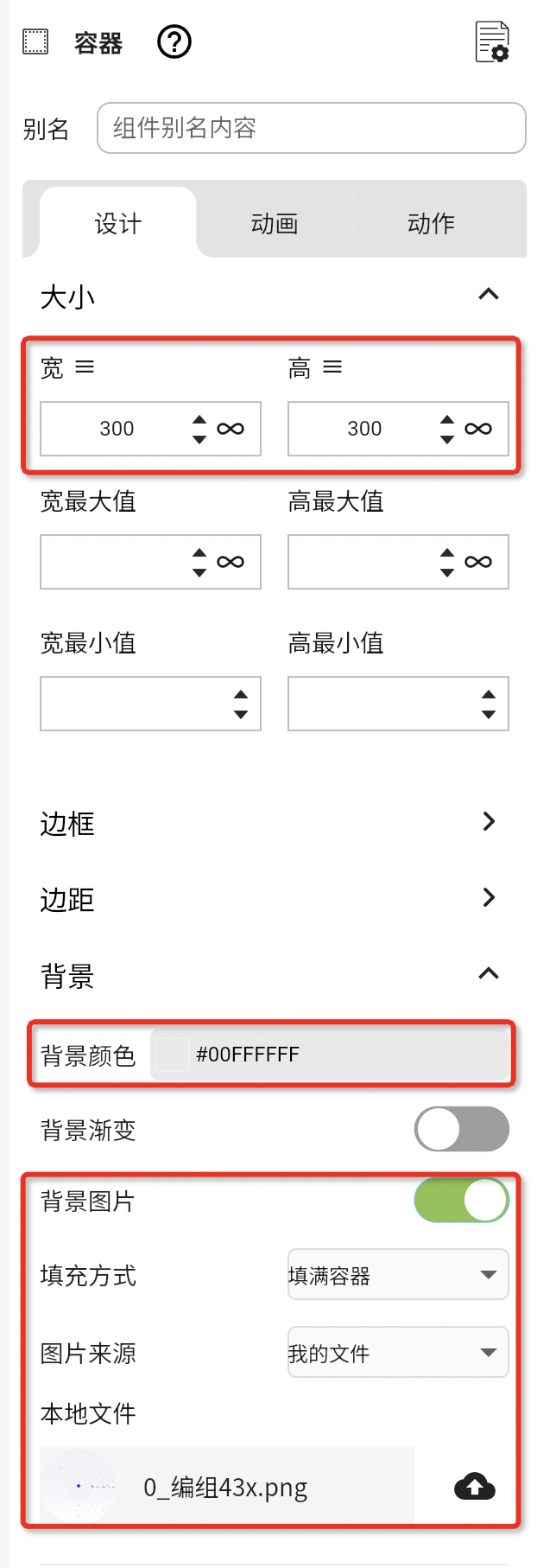 7.拖动容器到上下布局中,然后在右侧的属性编辑器中配置属性,属性信息如下: