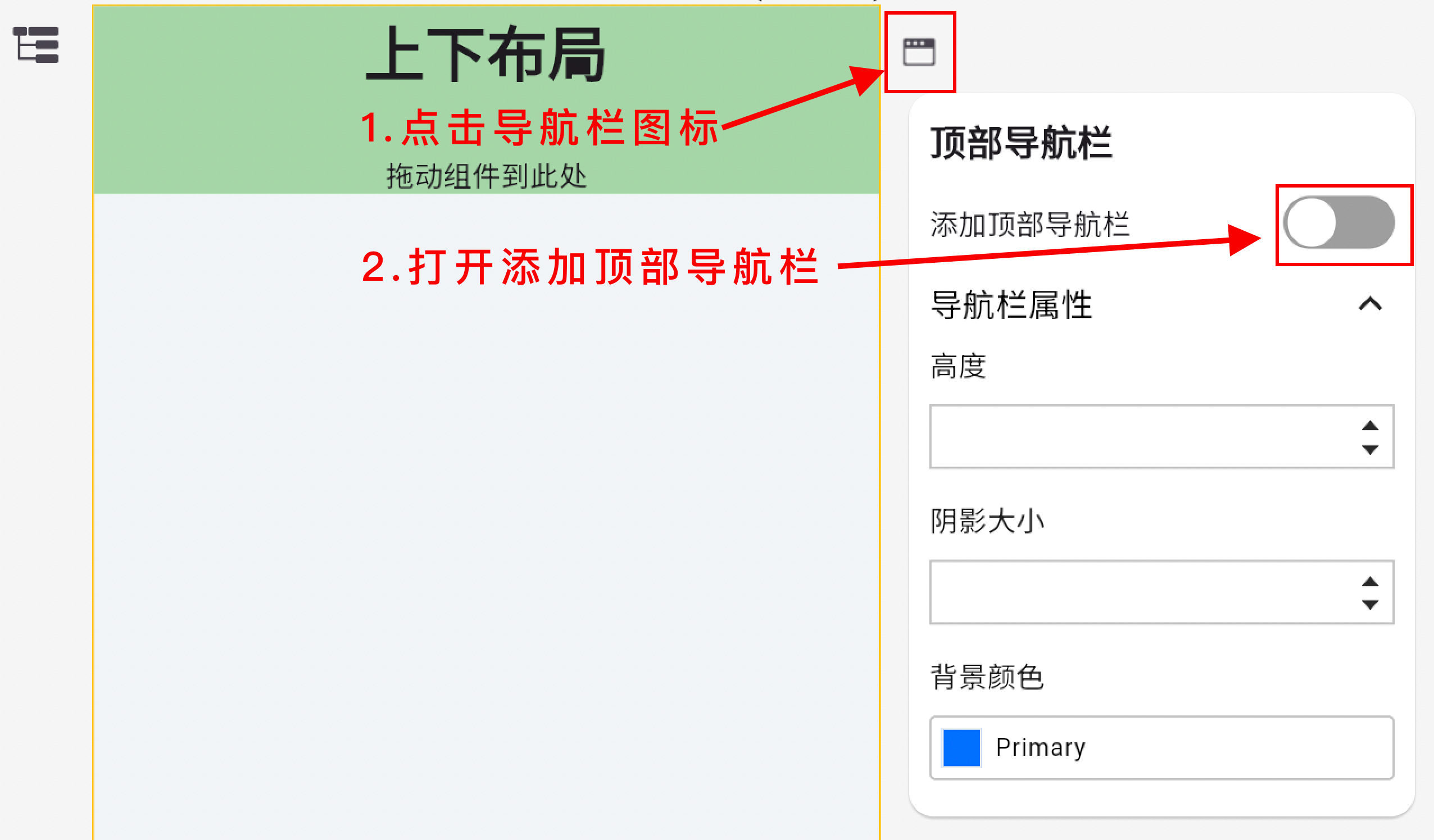 3.在页面预览区域点击顶部导航栏图标,打开添加顶部导航