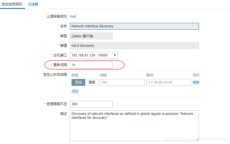 那么,如何更改间隔时间?点击进入其中一个规则 Network interface discovery, 里面就有更新间隔设置