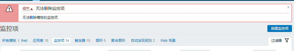 ###但是针对于上述第二种解决方案,链接模板里我们并不是所有的规则都需要,所以我们就要删除一些规则。但是在删除的时候又出现如下提示(这是因为规则并不属于fred模板而是属于linux os模板,fred模板里并没有权限去删除它)