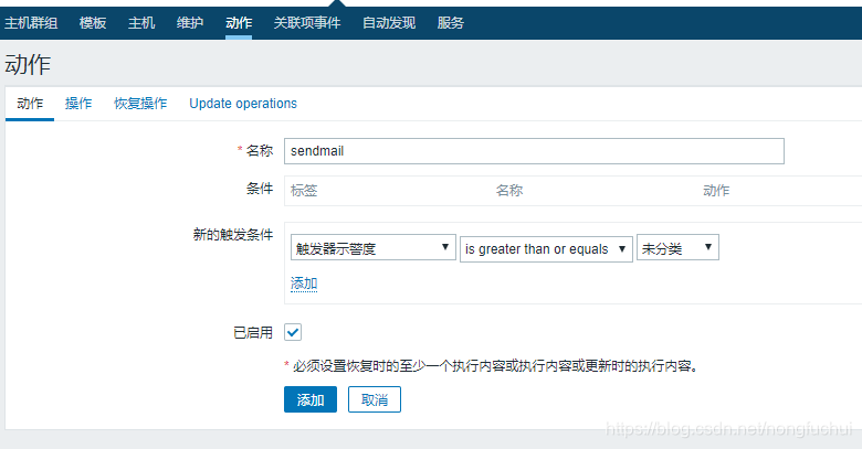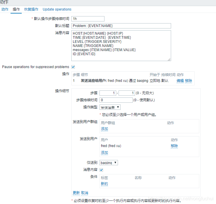 动作是指配置好了触发器,触发后要做什么?发邮件还是发短信还是执行一些脚本要做什么行为
