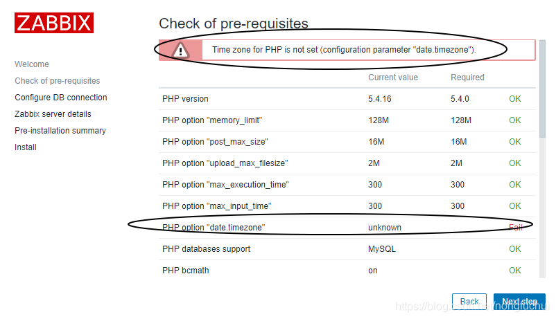在安装过程中出现如下错误提示,date.timezone报错(这个在/etc/php.ini里面定义)