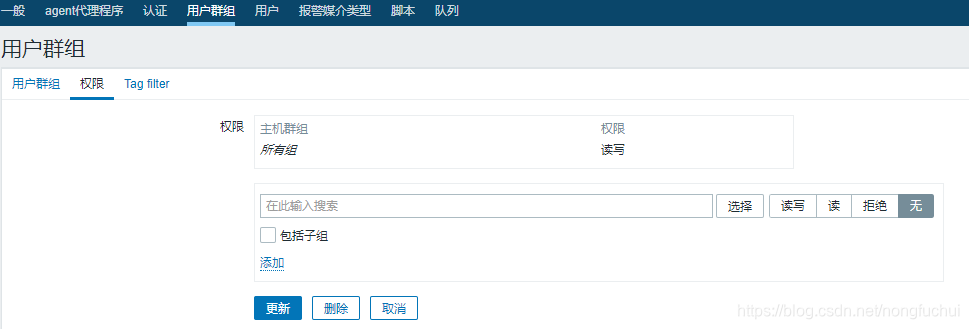 ^如果权限是无,我们如何添加权限?只能回到用户组里统一改权限(读写-选择所有组-添加-更新)