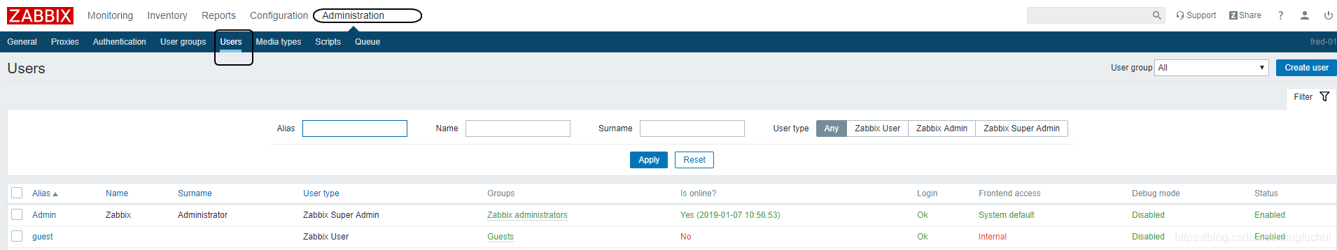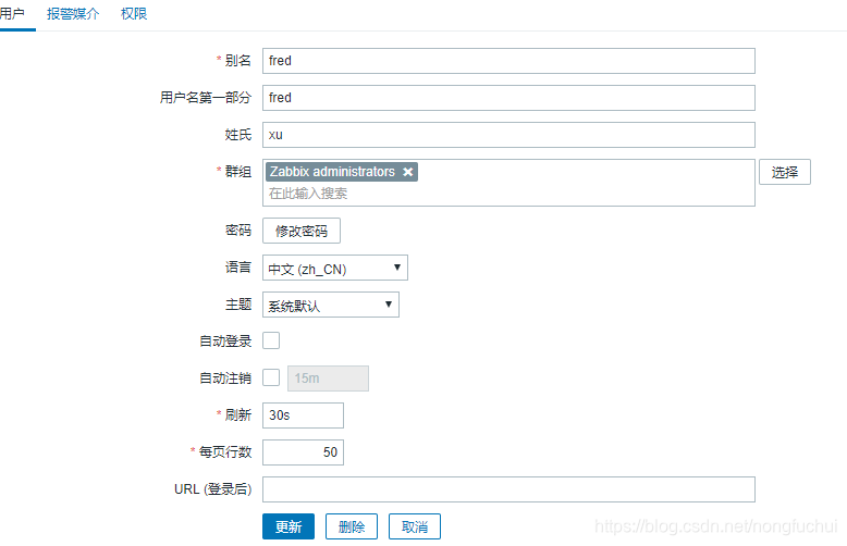 &接下来在zabbix网页页面创建用户(创建用户的前提是有一个用户组)