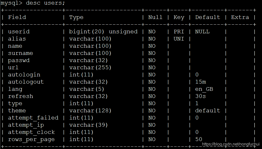 3.查看用户的字段 desc users; 这里的password字段就是我们要用的密码