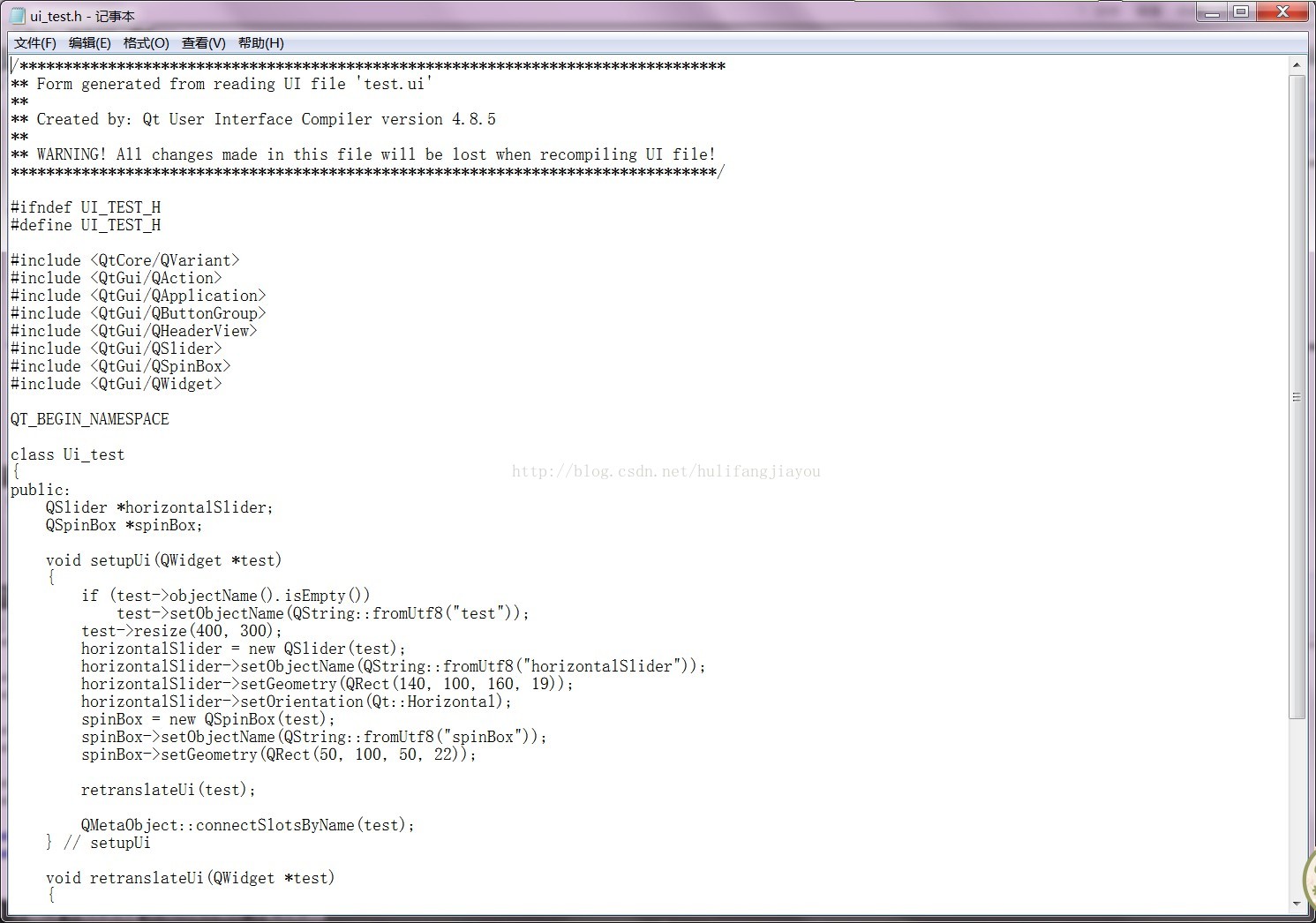 我们可以发现ui_test.h头文件中主要是一个类Ui_test的声明,以及一个控件的声明等,这里面的内容即为我们在Qt Designer中所设计的界面。类似于我们通过拖拽控件的方式完成了子类化widget。