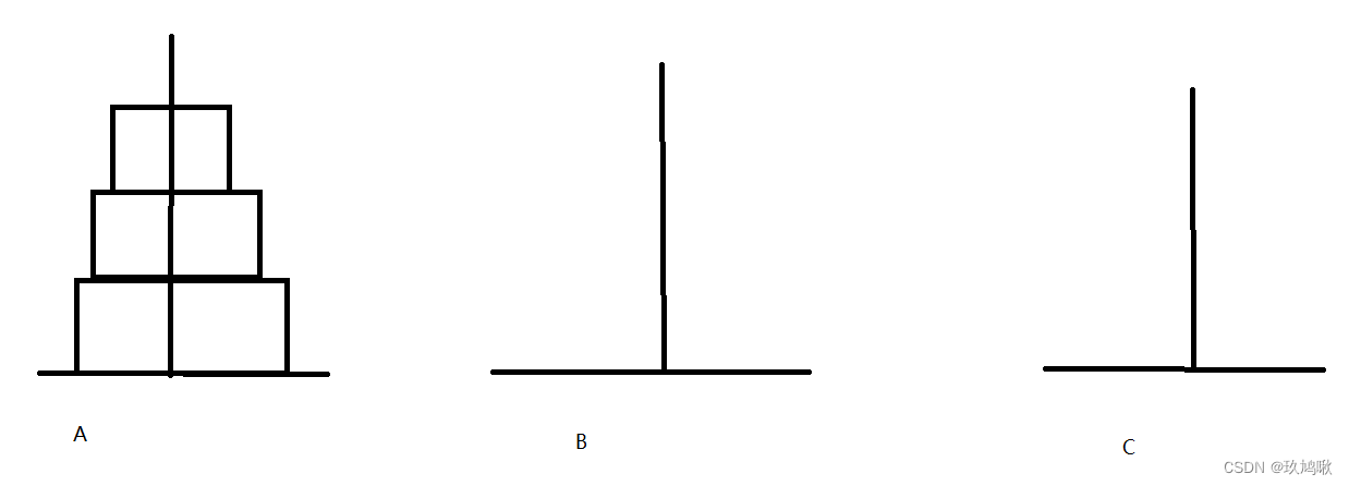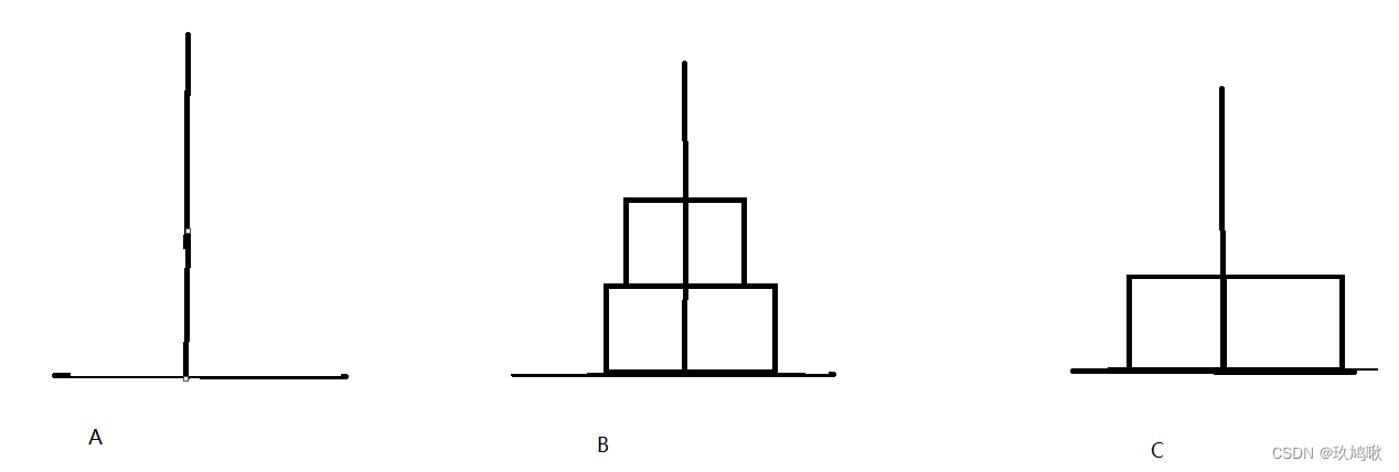 盘子从A下面开始按大小顺序重新摆放在C上。并且规定,在小圆盘上不能放大圆盘,在三根柱子之间一次只能移动一个圆盘。