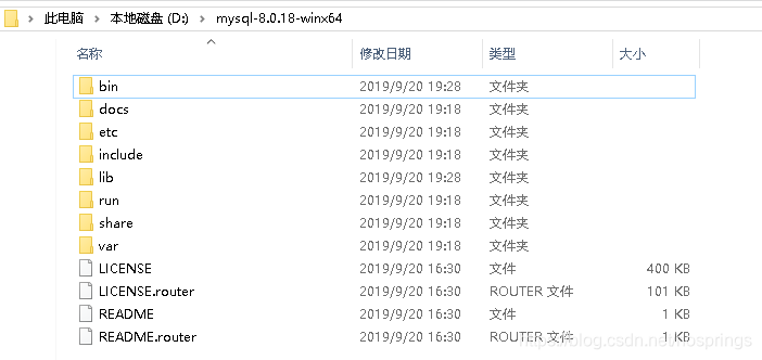 - 解压安装文件,放到D盘根目录:D://mysql-8.0.18-winx64(注意:不要路径太深或路径中存在中文或空格,避免不必要问题)