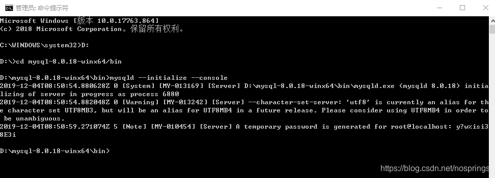 - 通过管理员打开命令行窗口,进入bin目录,D:\mysql-8.0.18-winx64\bin,执行:mysqld --initialize --console (注意:此操作会生成一个初始密码信息,请记住)