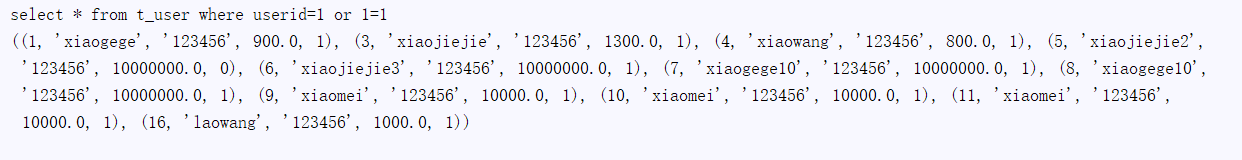 select * from t_user where username='xiaojiejie' and userpwd='1' or '1'='1'