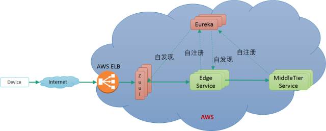 开发人员使用 Asgard(新版升级为 Spinnaker)发布系统在 AWS 云中创建新发布组,启动发布将镜像推到云中。服务实例启动后自注册到 Eureka 注册中心,开发人员使用 Asgard 动态调拨流量做金丝雀(Canary Testing)测试,测试成功则拉入全部流量,失败则退回之前版本。