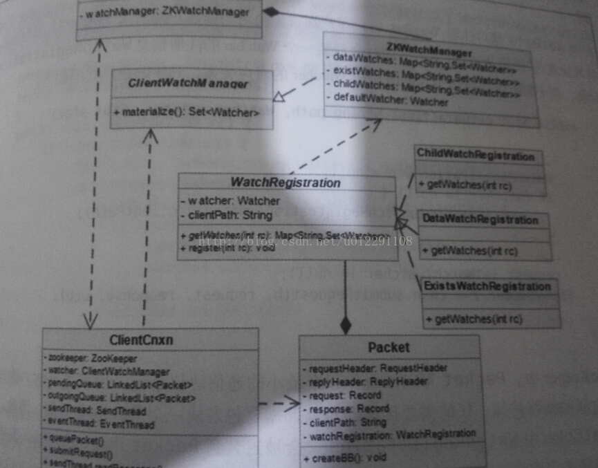 从上面的代码片段中,我们可以看到,在Packet.createBB()中,ZooKeeper只会讲requestHeader和reqeust两个属性进行序列化,也就是说,尽管WatchResgistration被防撞在了Packet中,但是并没有被序列化到底层字节数组中去,因此也就不会记性网络传输了。