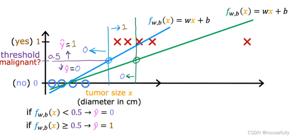 这时,再使用0.5作为阀值来预测肿瘤是良性还是恶性便不合适了。可以看出,线性回归模型,因为其预测的值可以超越[0,1]的范围,并不适合解决这样的问题。