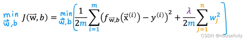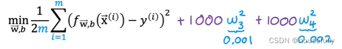 所以我们要做的就是在一定程度上减小这些参数w的值,这就是正则化的基本方法。我们决定要减少w3和w4的大小,我们要做的便是修改代价函数,在其中w3 和w4 设置一点惩罚。这样做的话,我们在尝试最小化代价时也需要将这个惩罚纳入考虑中,并最终导致选择较小一些的 w3和w4。