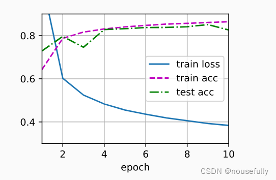 多层感知机的训练过程与softmax回归的训练过程完全相同。 可以直接调用d2l包的train_ch3函数, 将迭代周期数设置为10,并将学习率设置为0.1.