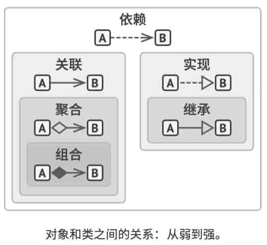 (大学 ◆—> 学院) - 实现:类 A 定义的方法由接口 B 声明。 对象 A 可被视为对象 B。 类 A 依赖于类 B。