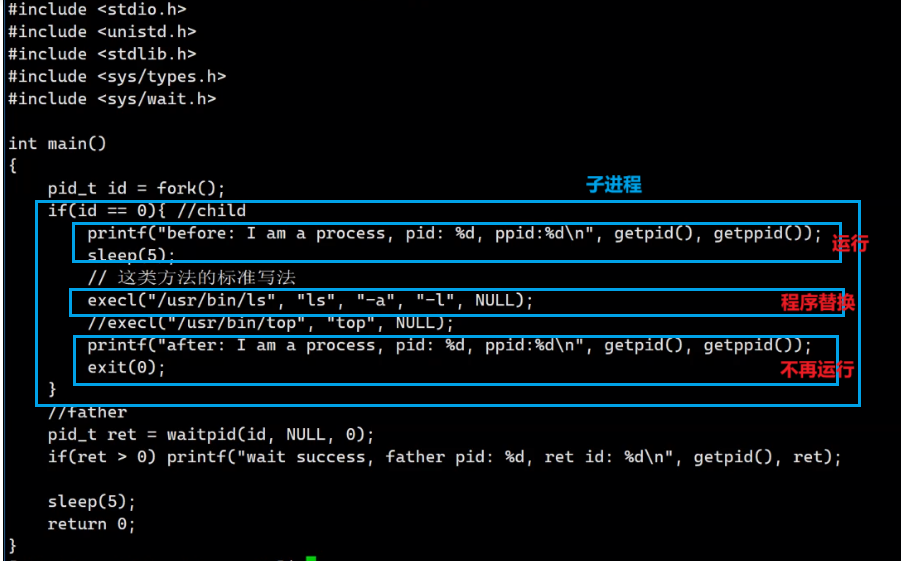 原因就是进程替换后原有代码已经被覆盖,爱不再存在