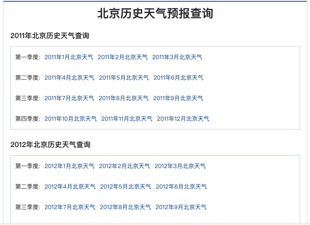 为了爬取到北京、天津两地各个月份每一天的所有天气信息,我们小组首先先对网页的层次进行解析,发现网站大体可以分为三层。