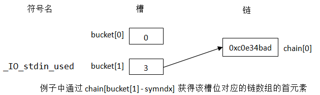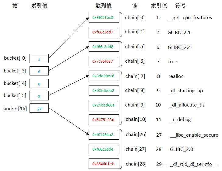 以链表的形式打印SYSV散列算法各个符号的值,如bucket[ 0]( 3) --> chain[ 3]( 1) --> chain[ 1]( 0),bucket[ 0]、chain[ 3]和chain[ 1]表示元素的位置,其后小括号中的数字就是该位置中的值。bucket[ 9]中没有元素,每个链表都以0值为结尾。可以看出,它们是通过上一个位置的值来确定一下位置的。