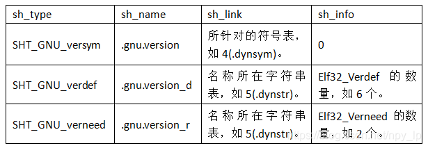对于动态链接符号的版本信息,当前系统的链接器共使用三个section来支持,分别为SHT_GNU_versym(.gnu.version)、SHT_GNU_verdef(.gnu.version_d)和SHT_GNU_verneed(.gnu.version_r)。动态库定义符号的版本信息(保存在.gnu.version_d section),可执行程序和动态库引用(其它)动态库所定义的符号版本信息(保存在.gnu.version_r section)。