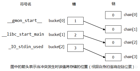从打印信息中可知,SYSV散列算法打印的符号的顺序与通过执行readelf命令打印的顺序不一致,这是因为这个例子中所使用的符号的顺序已经是GNU散列算法排序之后的,但从中更能看出同一槽位的符号是先进后出的。