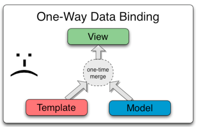 让们首先来看传统的基于模板的数据绑定实现(如下图所示), 模型通过后台逻辑处理后将一次性的投射到页面模板上,以视图展现出来。在第一次绑定后,模型状态发生变化将不会自动更新视图,这就意味着开发者得自己编写代码同步模型及视图。