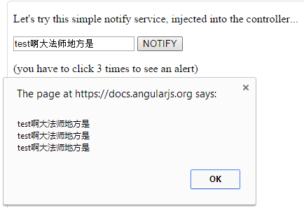 3. 在js代码中我们分别实现了MyController控制器和notify服务,notify服务通过factory的工厂方法来实现,依赖于$window服务,在构造函数的形参中声明“factory('notify', ['$window', function(win) {...”, 在MyController构造方法中添加了‘notify'依赖“controller('MyController', ['$scope','notify', function ($scope, notify)”,注意所声明的依赖的顺序必须与最后一个方法中的参数顺序保持一致,这样我们就可以在控制器中使用服务器组件了。