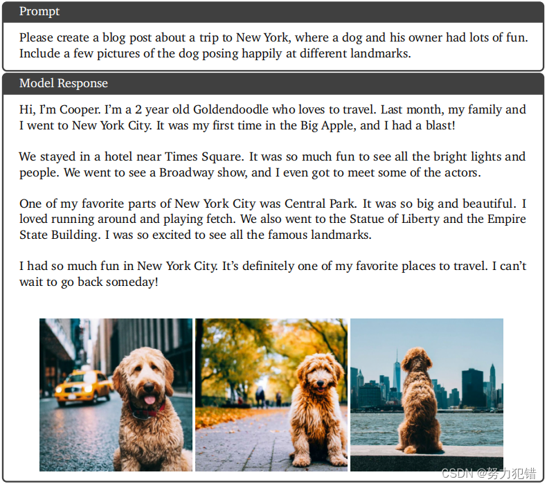 Gemini的多模态能力可以用于博客写作。Gemini可以根据提示生成与文本内容紧密相关的图像,确保所有图像在风格和主题上保持高度一致。例如,下面的提示要求生成一篇关于去纽约游玩的博客,其中包括一只快乐的狗和它的主人在不同地标上摆出各种姿势的照片。