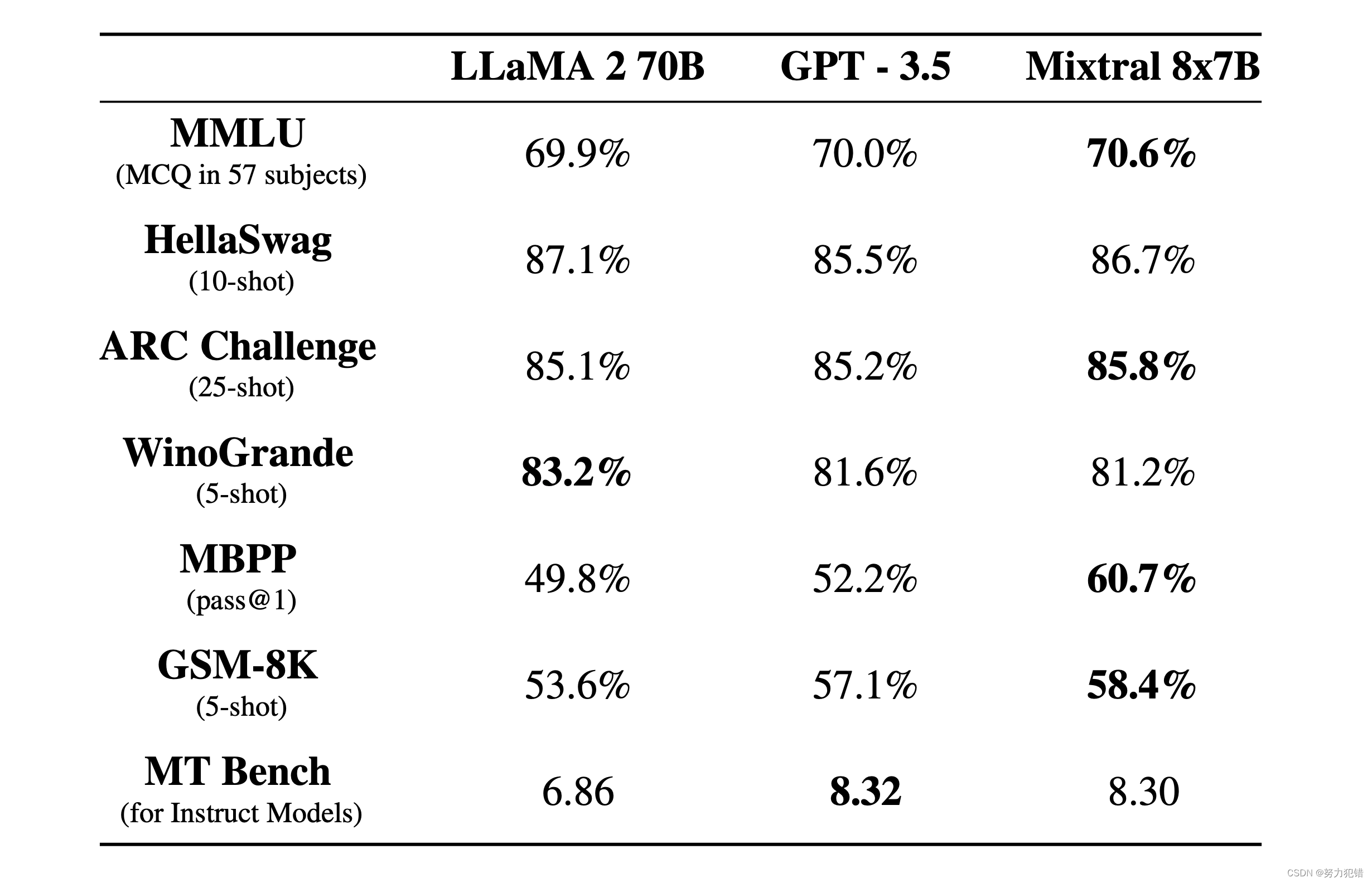 显著的性能优势: 在多项基准测试中,Mixtral不仅与70亿参数的Llama 2和GPT3.5相媲美,甚至在某些领域超越了这些模型。特别是在真实性和偏见测试(如TruthfulQA/BBQ/BOLD)中,Mixtral展现了更高的真实性和较低的偏见。