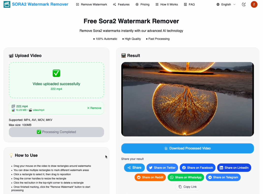 处理完成后,页面上会直接显示出去除水印后的视频效果,并提供一个下载按钮。点击下载,一个干净、高清、无水印的Sora视频就保存到你的电脑里了!