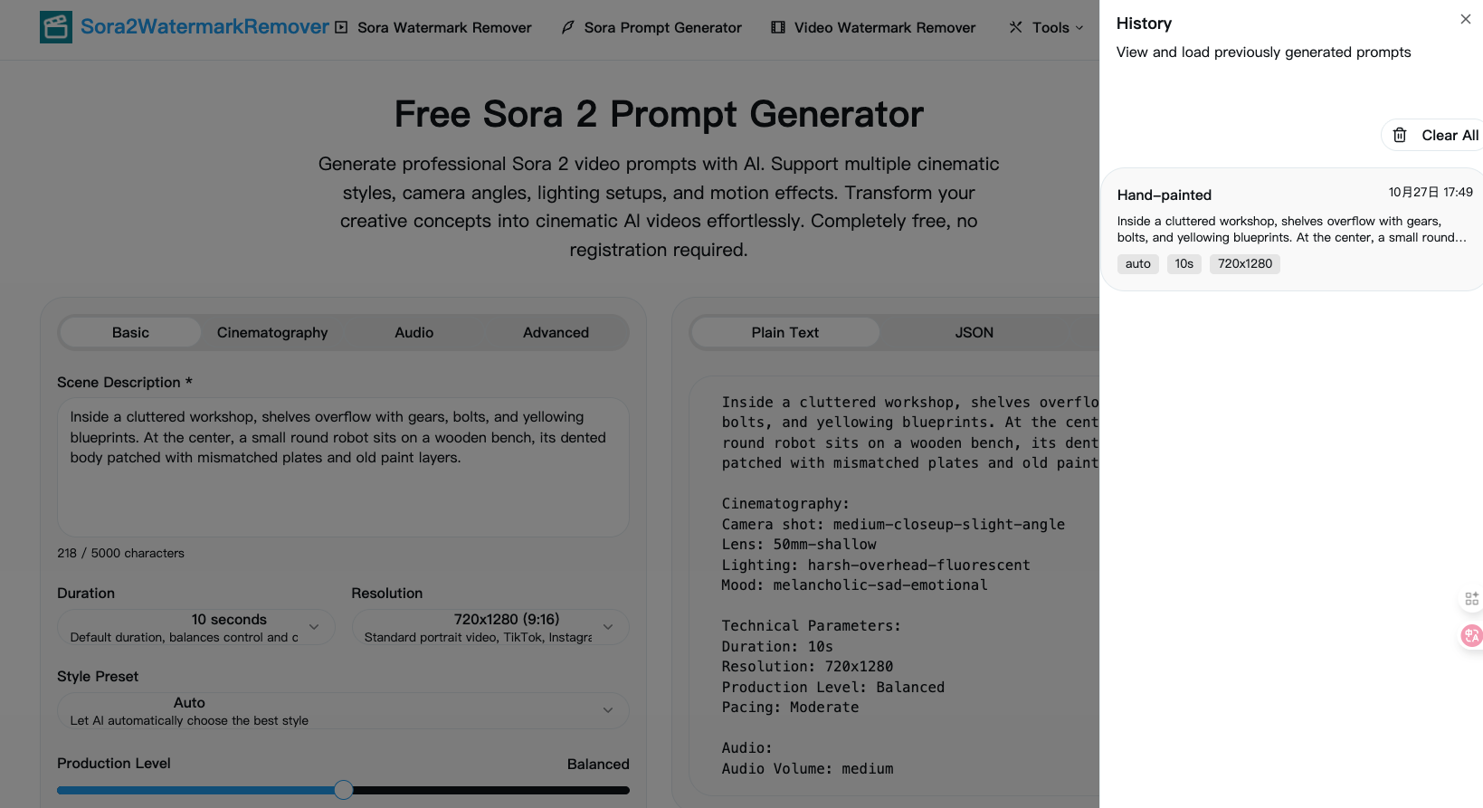 工具地址:https://sora2watermarkremover.net/sora-prompt-generator