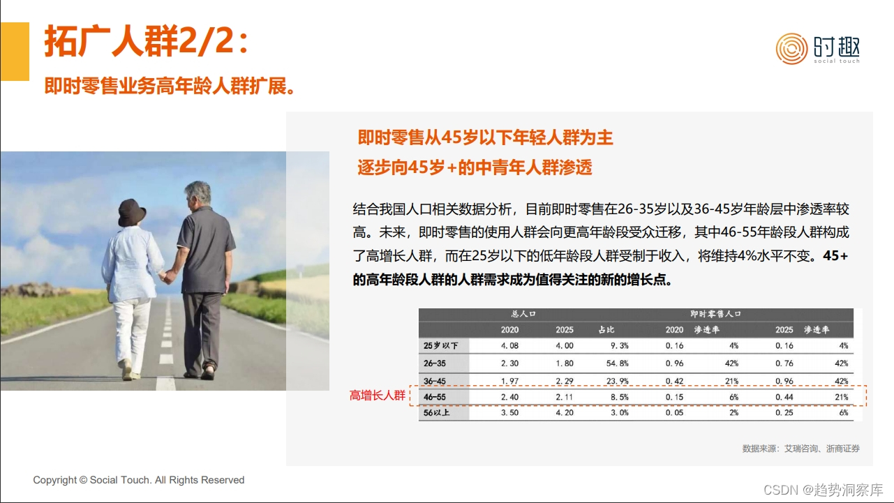 - 拓广人群:电商业务地域人群的扩展,即时零售业务高年龄人群扩展。