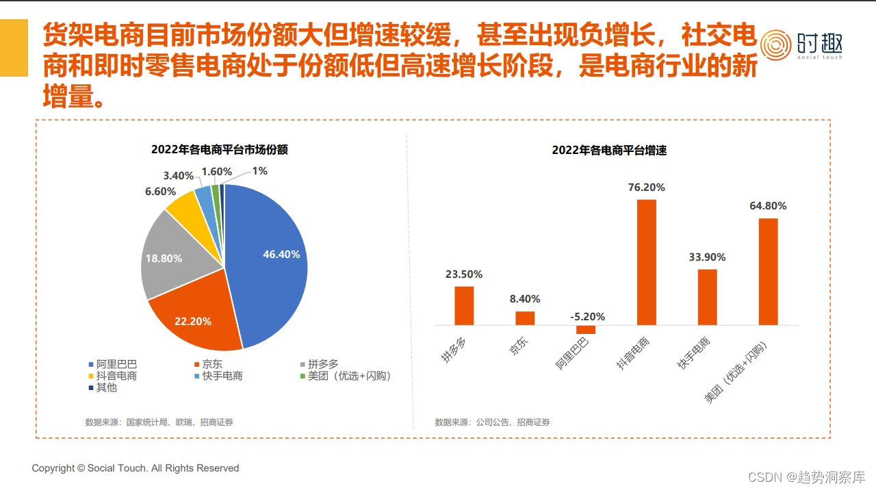 - 货架电商市场份额大但增速较缓,社交电商和即时零售电商处于份额低但高速增长阶段。