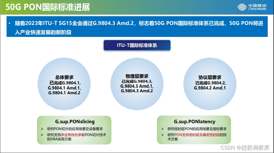 - 国际标准进展:ITU-T SG15全会通过了50G PON的国际标准体系,为50G PON技术的快速发展奠定了基础。