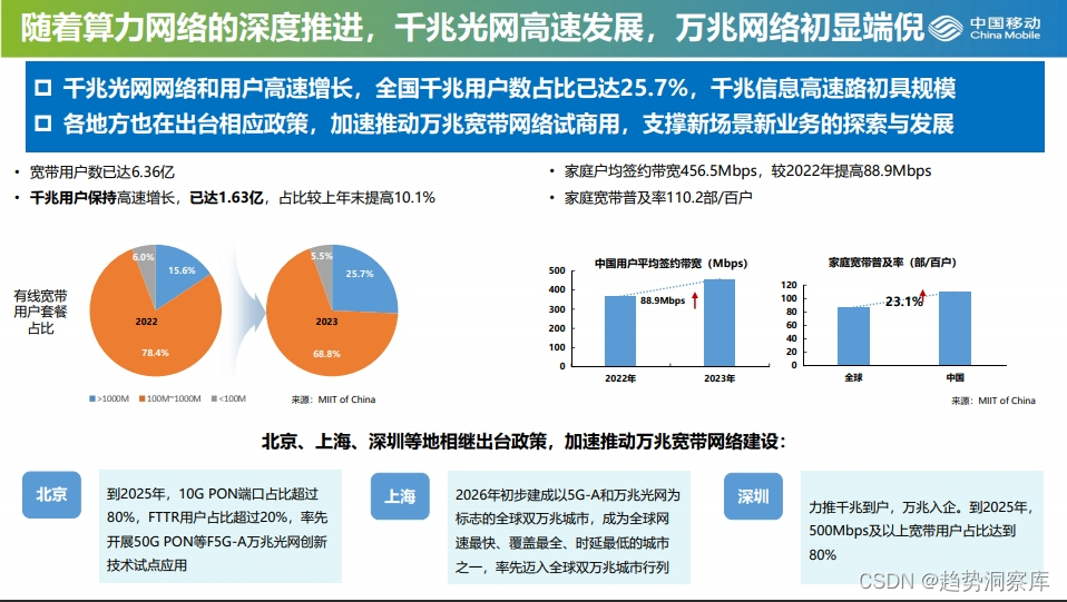 - 千兆光网的快速发展:全国千兆用户数占比已达25.7%,显示出千兆光网的快速增长和普及。