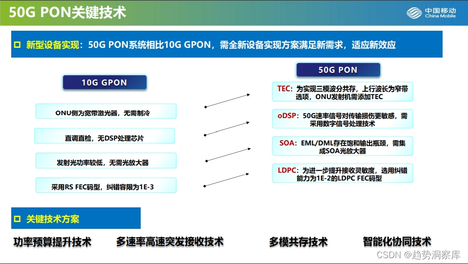 - 关键技术:报告详细介绍了50G PON的关键技术,包括高功率预算收发、oDSP技术、多模MPM共存、低时延及网络切片技术、光接入网智能化等。