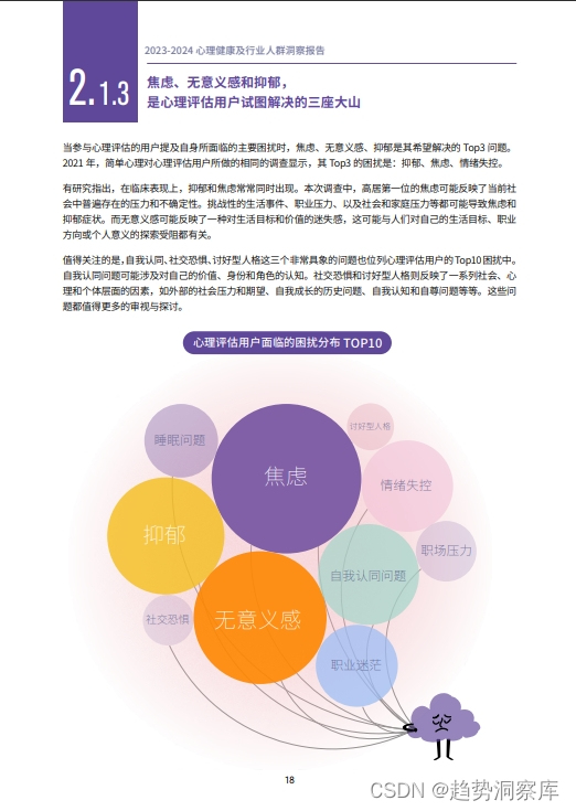 - 用户主诉:心理评估用户主要面临的困扰包括焦虑、无意义感、抑郁等,反映出社会中普遍存在的压力和不确定性。