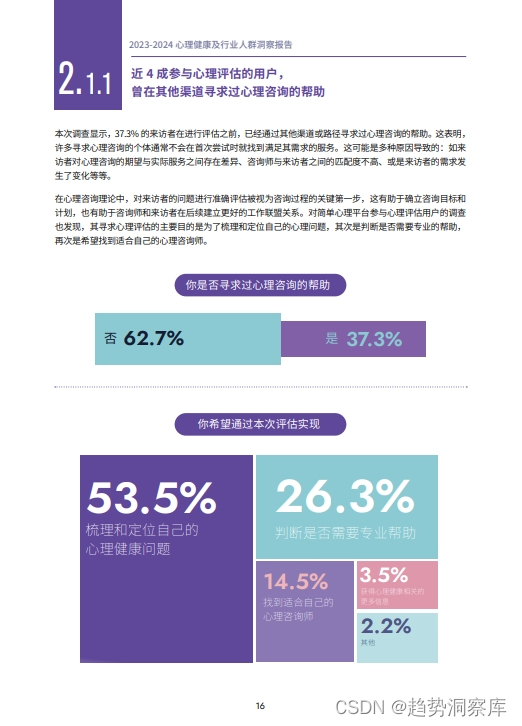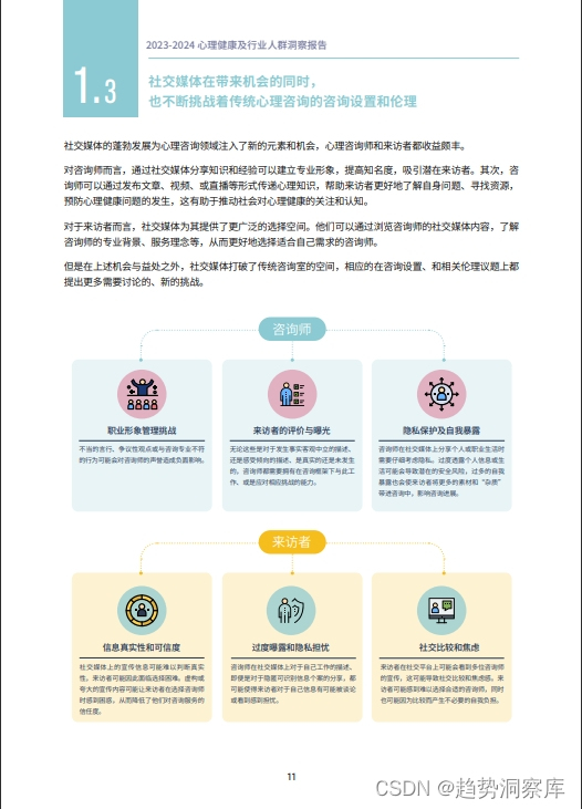 - 来访者画像:女性占心理咨询用户的主体,20-40岁的年轻人群是咨询主力,高学历和高收入背景的来访者较多。