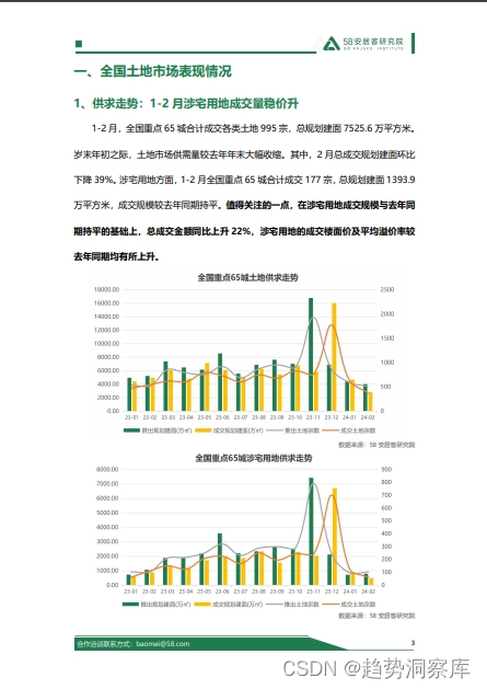 报告揭示了2024年1-2月全国重点65城市土地市场概况,涉宅用地成交平稳但楼面价和溢价率上升,北京、杭州和西安等城市土地出让活跃,宅地流拍率略有下降,核心22城市场热度触底反弹。