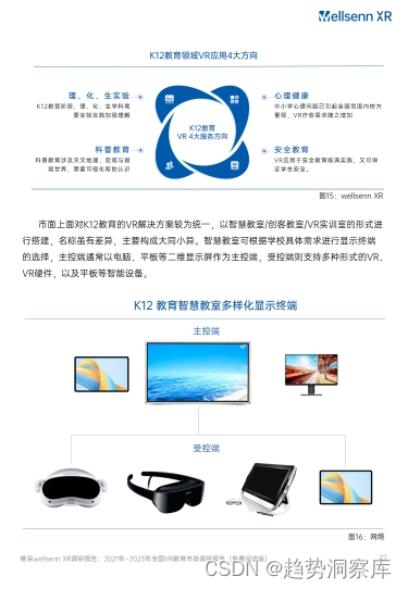 - VR教育在学前教育、K12教育、职业教育和高校教育中的应用情况有所不同,需求和解决方案也有所区别。