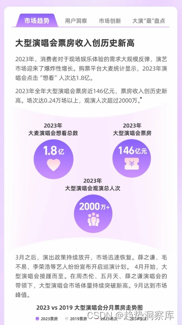 - 2023年大型演唱会市场迎来了爆炸性增长,票房收入达到历史新高,接近146亿元,观演人次超过2000万。