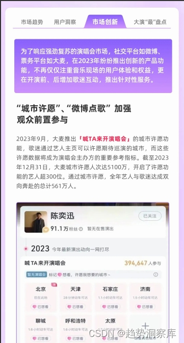- 社交平台和票务平台推出了创新产品功能,如“城市许愿”、“微博点歌”等,增强了观众的前置参与。