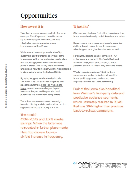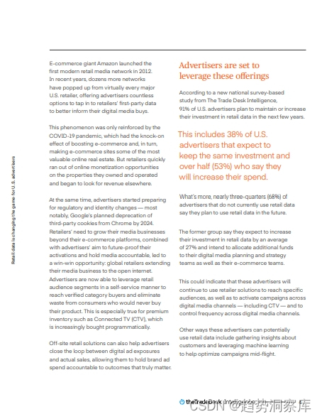 - 报告强调了零售数据、零售媒体和零售媒体网络(RMNs)的增长机会和使用情况。